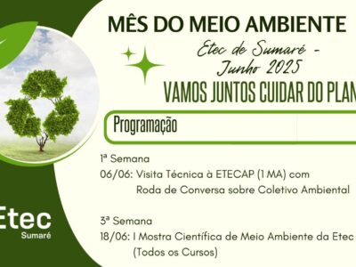 Junho é o Mês do Meio Ambiente, e a ETEC de Sumaré preparou uma programação especial para reforçar a importância da conscientização ambiental. Ao longo do mês, teremos palestras, oficinas, exposições e ações sustentáveis desenvolvidas […]