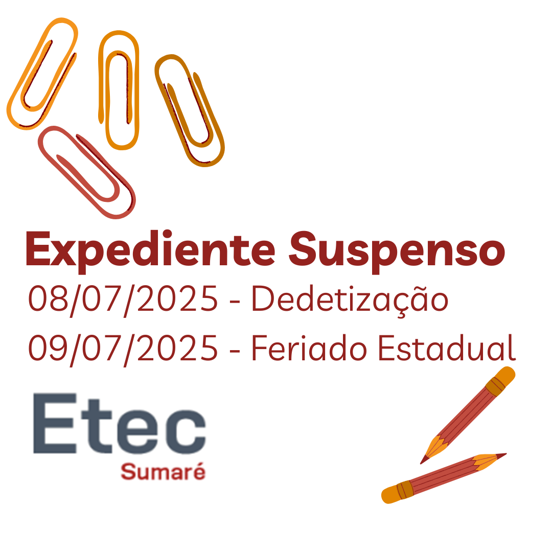 A Etec de Sumaré informa que nas datas abaixo o expediente será suspenso. 08/07/2025 – Dedetização do Prédio 09/07/2025 – Feriado Estadual No dia 10/07/2025 retornam as atividades normais, em horário de atendimento de recesso.