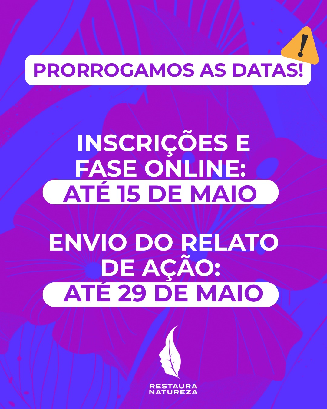 As inscrições da Restaura Natureza foram prorrogadas! O envio do relato de ação também!➡️Se liga nas novas datas: Inscrições de novos usuários e fase online até 15 de maioEnvio do relato de ação até dia […]